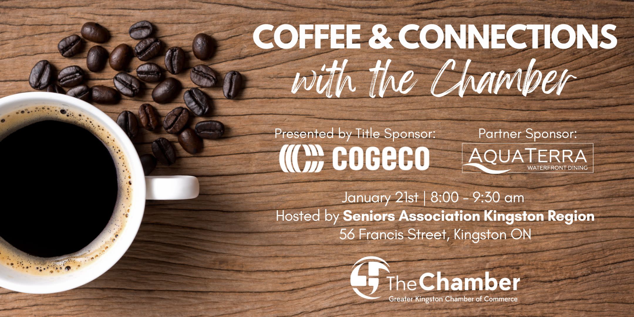 Chamber members are invited to attend Coffee & Connections with the Chamber taking place Tuesday, January 21st from 8:00 to 9:30 am at Seniors Association Kingston Region (56 Francis Street, Kingston ON)!