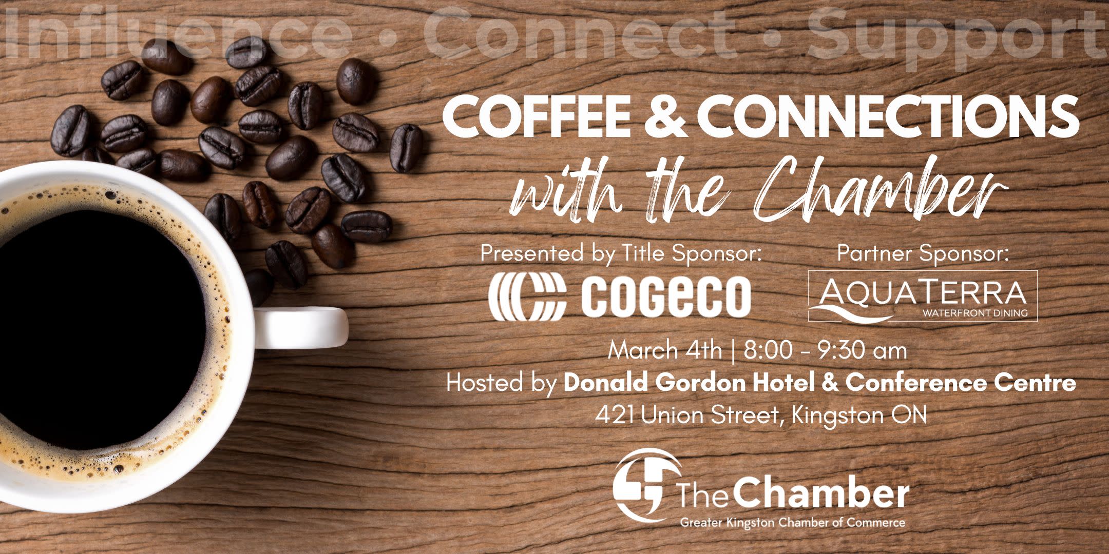 Chamber members are invited to attend Coffee & Connections with the Chamber taking place Tuesday, March 4th from 8:00 to 9:30 am at Donald Gordon Hotel and Conference Centre (421 Union Street, Kingston ON)!