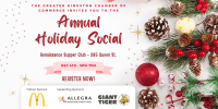 Join us Thursday, December 4th at 5:00 pm for our Annual Holiday Social! This will be a festive evening of engaging with your business community, and a great opportunity to reconnect with old friends while making some new ones while celebrating the ...