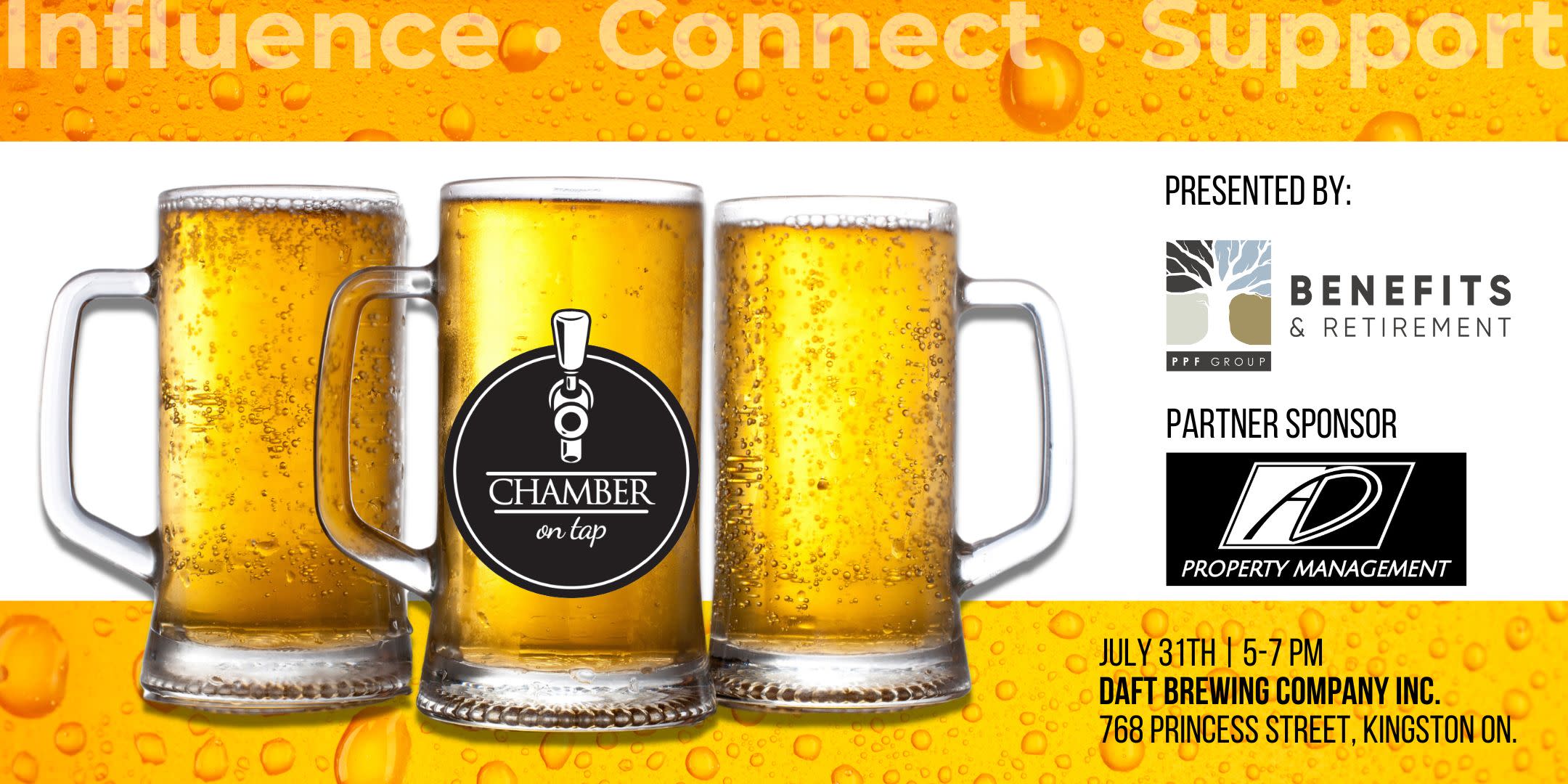 Introducing our premium after-hours business networking event, Chamber on Tap! Join us Thursday, July, 31, 2025 from 5:00pm to 7:00pm at Daft Brewing Company Inc. (768 Princess Street, Kingston ON) for a night of networking with like-minded professionals.